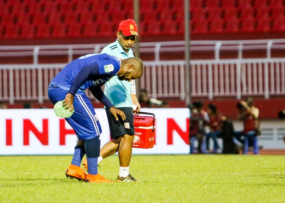 Nhìn cách rời sân của tay săn bàn Quảng Nam này cứ như kiểu Mohamad Salah của Liverpool sau va chạm với Ramos rồi phải từ giã trận chung kết Champions League rạng sáng 27-5 vừa qua vậy.