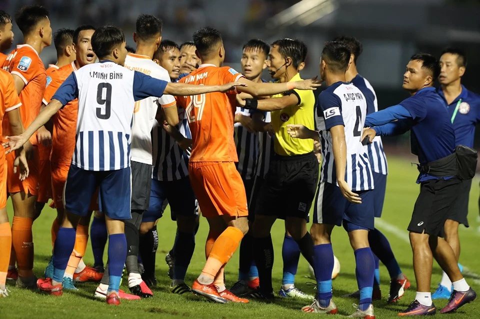 Trọng tài ngăn cản các cầu thủ Bà Rịa Vũng Tàu và Bình Định tranh cãi ở giải hạng nhất. Ảnh: ANH PHƯƠNG.