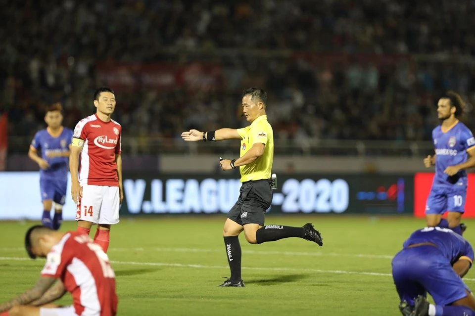 Tổ trọng tài Trần Đình Thịnh điều khiển rất tốt trận cầu nóng TP.HCM thua khách B. Bình Dương 1-2 ở vòng 8 V-League. Ảnh: ANH PHƯƠNG.