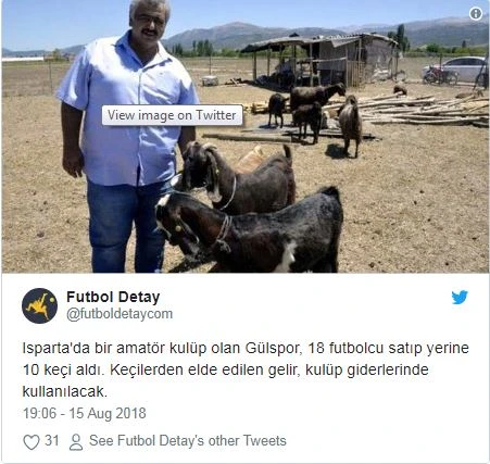 Câu lạc bộ (CLB) bóng đá Gulspor ở Thổ Nhĩ Kỳ gần đây đã chuyển nhượng 18 cầu thủ để mua 10 con dê, từ đó tăng thu nhập cho CLB từ việc bán thịt và sữa, CNN đưa tin.
