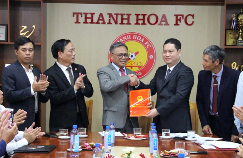 Chủ tịch Hội đồng thành viên kiêm Tổng Giám độc Tập đoàn Bất động sản Đông Á ông Cao Tiến Đoan tiếp nhận (trái) CLB Bóng đá Thanh Hóa. Ảnh: M.CƯỜNG