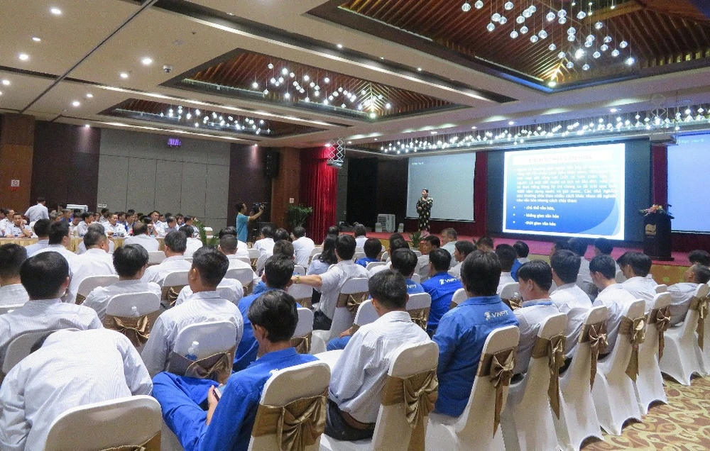 Hơn 200 cán bộ, công nhân viên của VNPT Bình Dương chăm chú nghe diễn giả Hồ Nhựt Quang trình bày về văn hóa dân tộc và văn hóa doanh nghiệp.