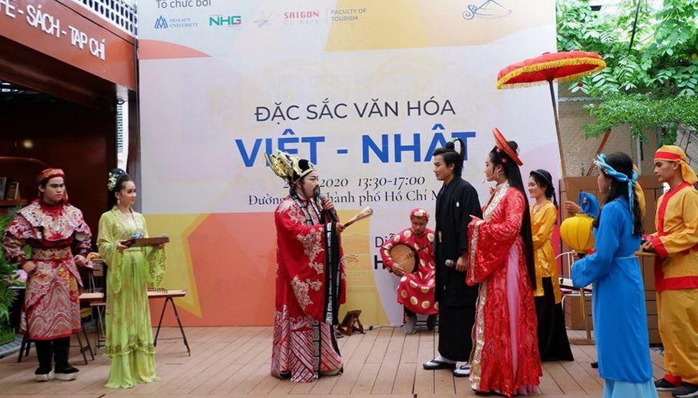 Các thành viên CLB trình diễn vở tuồng Công nữ Ngọc Hoa (Tác giả: Hồ Nhựt Quang) giới thiệu văn hóa Việt - Nhật tại Đường sách TP.HCM, ngày 27-6-2020.
