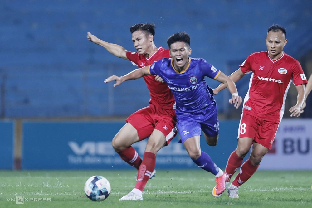Trọng Hoàng (bìa phải) ghi bàn duy nhất trận giúp Viettel đánh bại Hà Nội FC ở trận derby Hà Thành. Ảnh: CTV