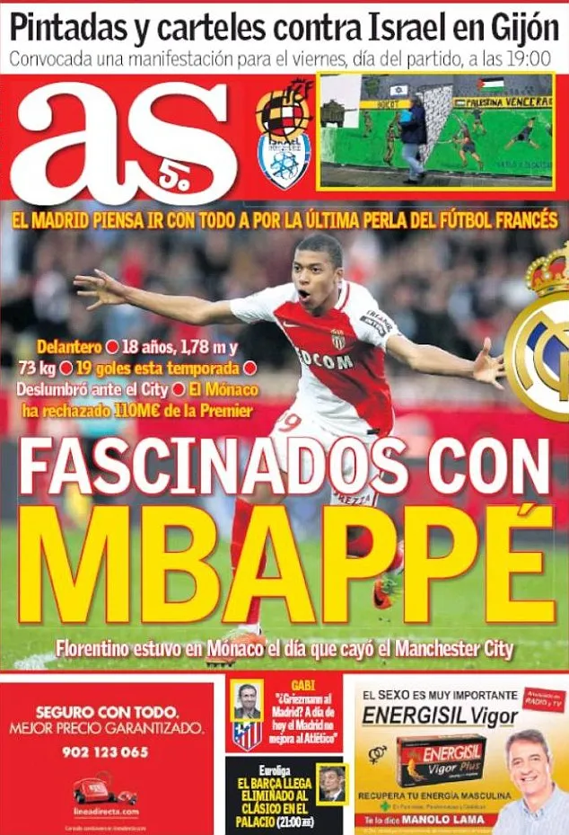 Tờ Marca (Tây Ban Nha) thì thông tin, chủ tịch Real Madrid, Florentino Perez đã ở Monaco theo dõi trận lượt về vòng 16 đội Champions League giữa AS Monaco và Man City. Mục đích chính không gì khác là theo dõi Mbappe thi đấu. Sau trận đấu này, vị chủ tịch Real ngay lập tức đưa Mbappe vào danh sách ưu tiên cần mua.