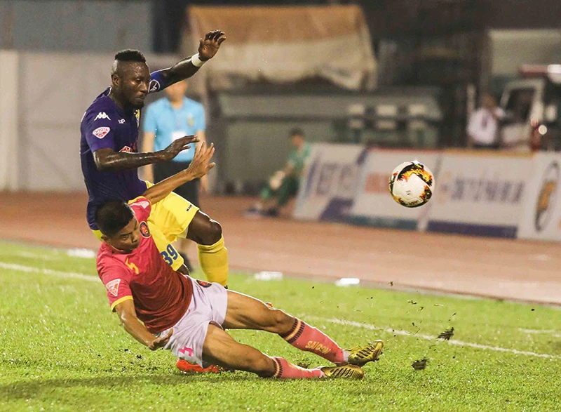 Samson (áo xanh) nỗ lực đi bóng qua hậu vệ Sài Gòn FC.