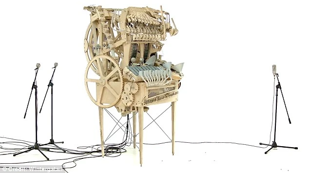Nhạc cụ bằng chiếc máy gỗ và sử dụng 2.000 viên bi, bánh răng để tạo ra những âm thanh của đàn tăng rung, trống… (Nguồn: Daily Mail)