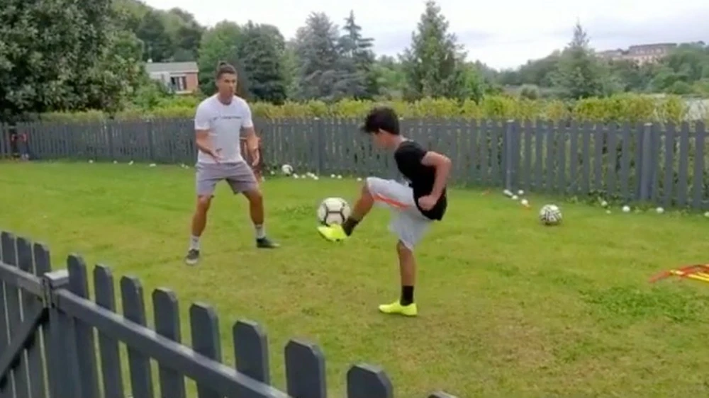 Ronaldo phấn khích tập luyện với con trai ở mảnh sân sau nhà tại Ý. Ảnh: TS
