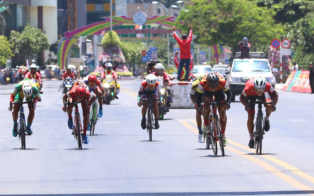Các tay đua nhóm đầu tung nước rút tại mức đến TP Nha Trang. ẢNH: HUỲNH VĂN THUẬN