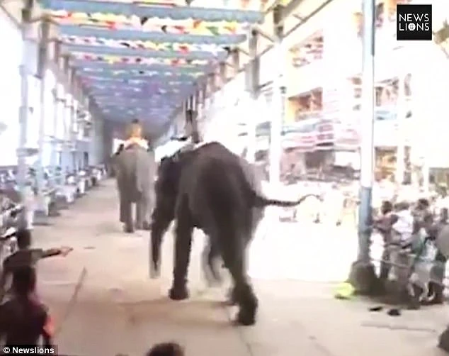 Một đoạn video kịch tính ghi lại khoảnh khắc hỗn loạn diễn ra, cho thấy một con voi bỗng dưng đạp đổ hàng rào bảo vệ và bắt đầu lao vào đám đông cách đó vài mét. Trong khi đó, một con voi khác xông thẳng vào đền thờ khiến những người bên trong hoảng loạn bỏ chạy.
