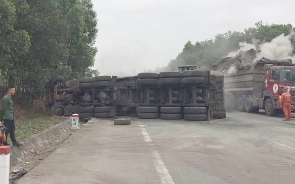 Xe đầu kéo lật chắn ngang quốc lộ 7C.