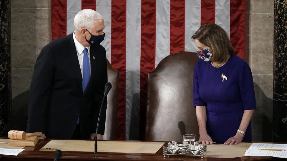 Ông Pence và bà Pelosi tại cuộc họp Quốc hội ngày 6-1. Ảnh: AP