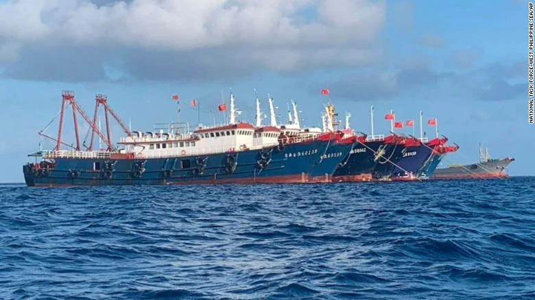 Chính quyền Philippines đã công bố hình ảnh và video ghi lại cảnh hàng trăm chiếc tàu Trung Quốc đang neo đậu tại Đá Tư Nghĩa, Đá Ga Ven và Đá Ba Đầu ngày 27-3. Ảnh: CNN