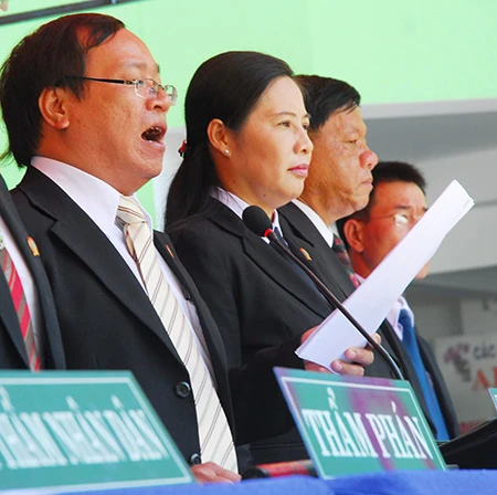 Chủ tọa đang tuyên án trong một phiên tòa lưu động tại TP.HCM. Ảnh: HTD
