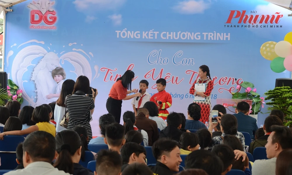 | Chương trình “Cho con tình yêu thương” do báo Phụ Nữ TP.HCM phối hợp với nhãn hàng Sữa dê công thức DG tổ chức từ ngày 28-3 đến 1-6-2018 tại 11 mái ấm, nhà mở, trung tâm bảo trợ trẻ em trên địa bàn TP.HCM với sự tham gia của hơn 500 trẻ em mồ côi, khuyết tật, trẻ bị bỏ rơi từ 6 đến 14 tuổi. Thông qua các bài tham dự bằng tranh vẽ, kể chuyện, các em đã có dịp bày tỏ những ước mơ sâu kín, chân thật của mình. Chương trình đã chọn giúp hiện thực hóa ước mơ của một số bé. Đó là giúp cô bé Yến Nhi trở thành hoa hậu, phát quà cho các em bé mồ côi, khuyết tật ở mái ấm Bông Huệ (huyện Hóc Môn); bé Đoàn Nhật Minh trở thành lính cứu hỏa; bé Trần Ngọc Hồng lên sóng truyền hình để tìm ba mẹ báo hiếu ơn sinh thành… |