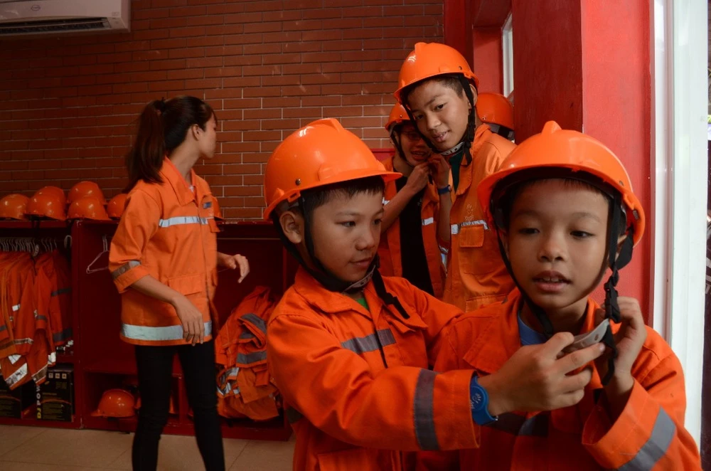 Bé Nhật Minh (trái) cùng các bạn được làm lính cứu hỏa một ngày. Ảnh: TL