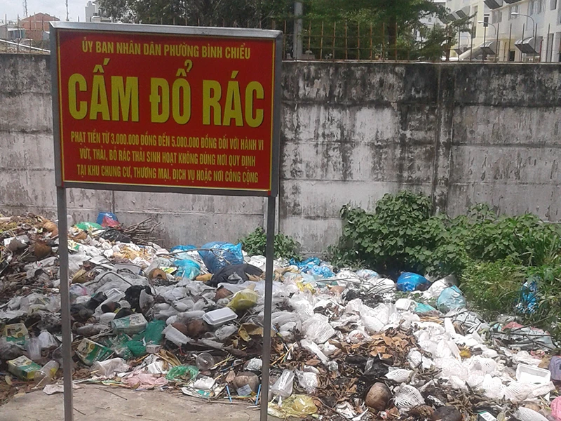 Kèm theo biển này là trích quy định phạt tiền các hành vi vứt, xả rác bừa bãi, không đúng nơi, đúng chỗ... Thế nhưng ngay tại chính nơi cắm tấm biển đó, rác thải bị chất thành đống khi mà người dân thiếu ý thức sống quanh đó vẫn bất chấp mang rác ra vứt (ảnh).