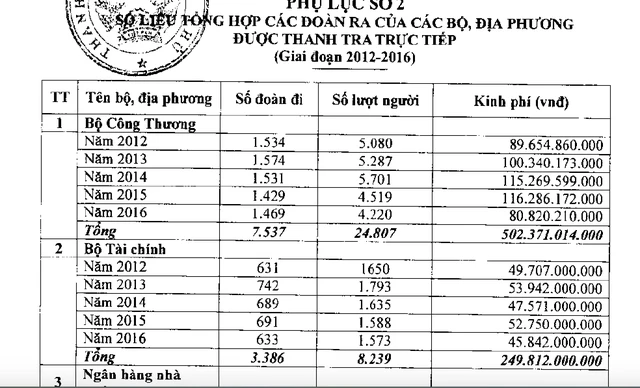 Cũng theo kết quả kiểm tra, giai đoạn năm 2012-2014, Bộ Tài chính cử hơn 5.000 đoàn công tác, với khoảng 11.800 lượt cán bộ đi nước ngoài. Tổng chi phí cho các chuyến xuất ngoại này vào khoảng 250 tỉ đồng. Cơ bản các đoàn đi của Bộ Tài chính đều nằm trong kế hoạch và thực hiện đúng quy định.