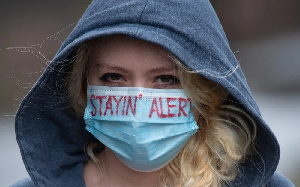 Một cô gái ở TP Manchester (Anh) đeo khẩu trang có dòng chữ "Hãy cảnh giác". Ảnh: TELEGRAPH/ALAMY NEWS