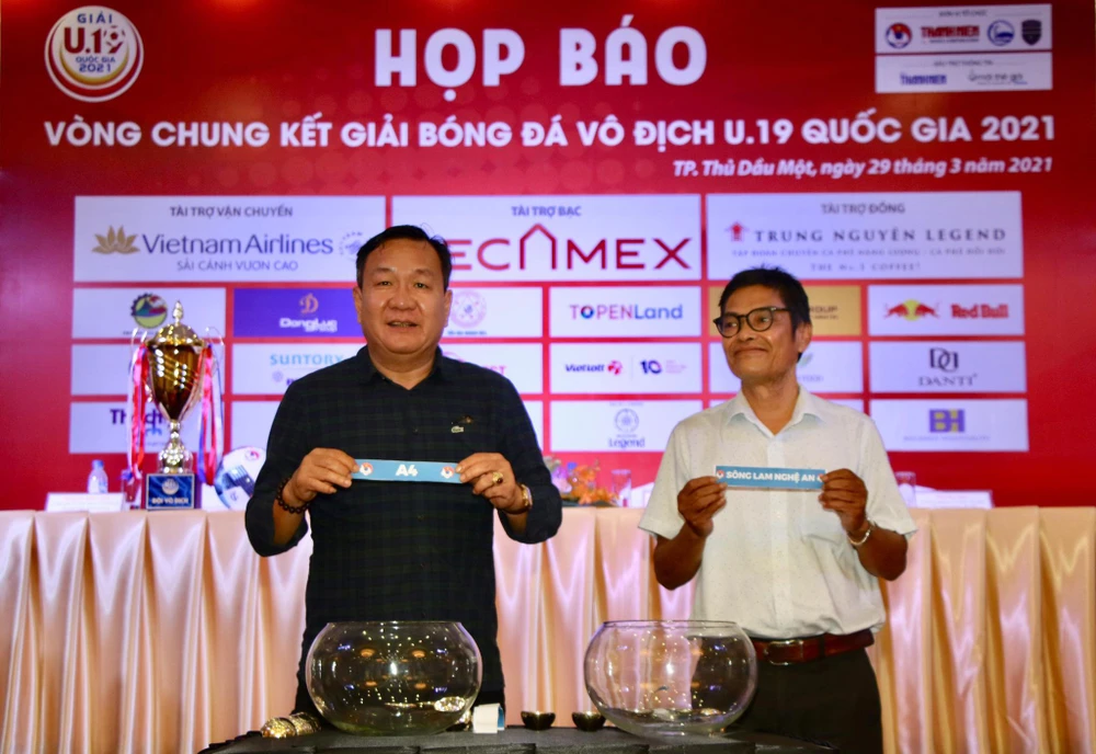 HLV Hoàng Văn Phúc (trái) của Hà Nội và HLV Đoàn Phùng của Quảng Nam tham gia bốc thăm các bảng. Ảnh: K.H