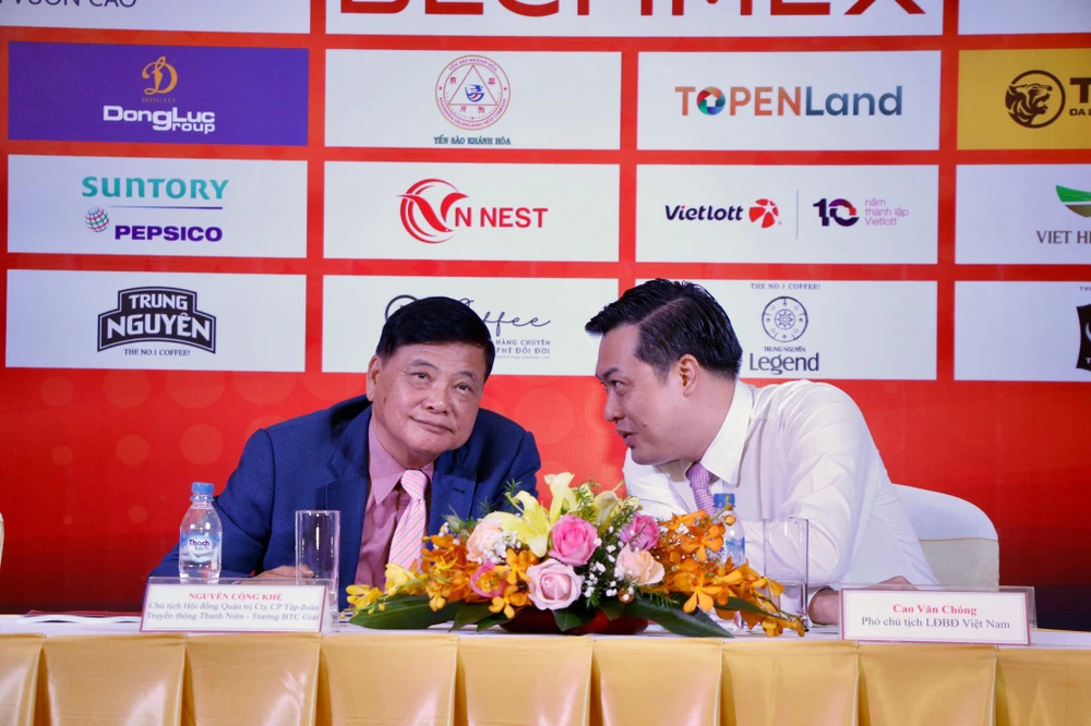 Trưởng BTC giải Nguyễn Công Khế (trái) và Phó Chủ tịch VFF Cao Văn Chóng trao đổi tại buổi họp báo. Ảnh: KHẢ HÒA