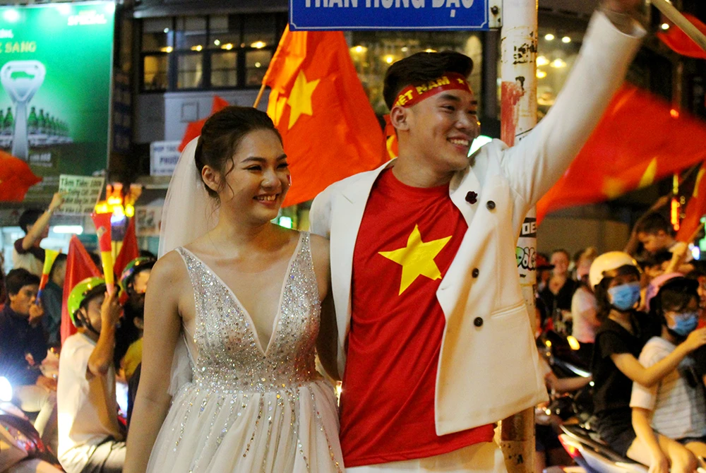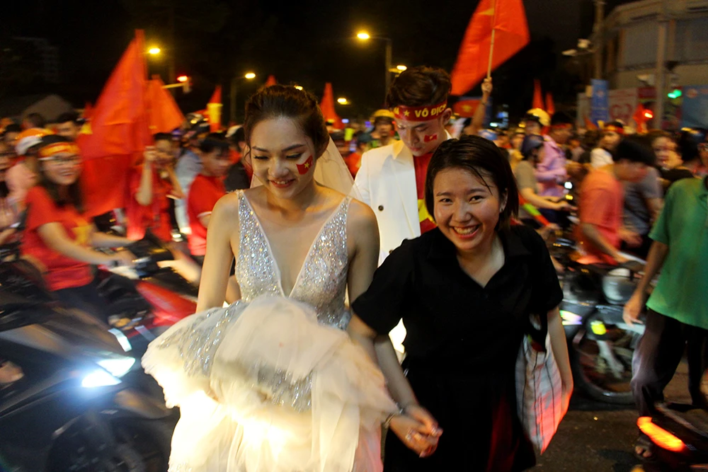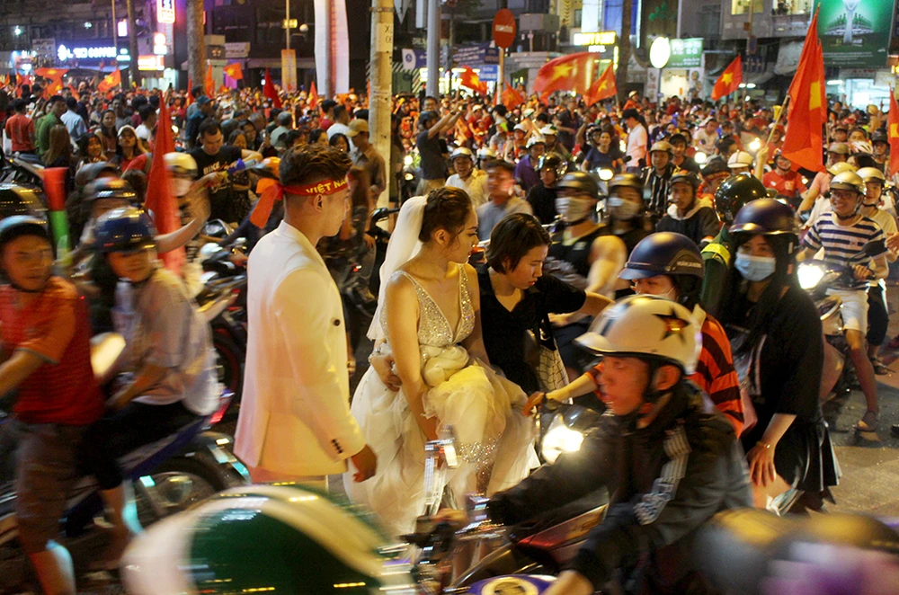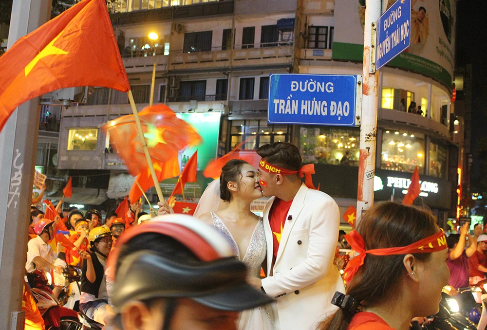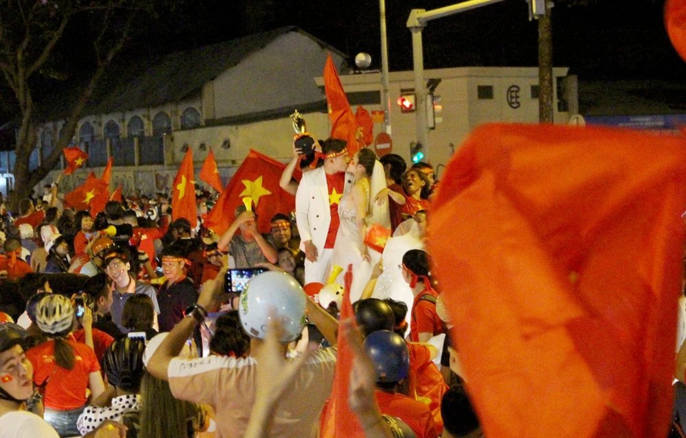 Tại khu vực Trần Hưng Đạo – Nguyễn Thái Học (quận 1), người hâm mộ liên tục thổi kèn, gióng trống, đốt pháo, hô vang khẩu hiệu Việt Nam vô địch. Giữa muôn kiểu ăn mừng chiến thắng, có một cặp cô dâu chú rể trẻ dắt tay nhau đi len lỏi giữa dòng “bão” này để chụp ảnh cưới.