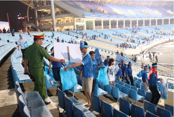 Rất nhiều chai lọ, rác thải xuất hiện trên khán đài đã được thu gom.
