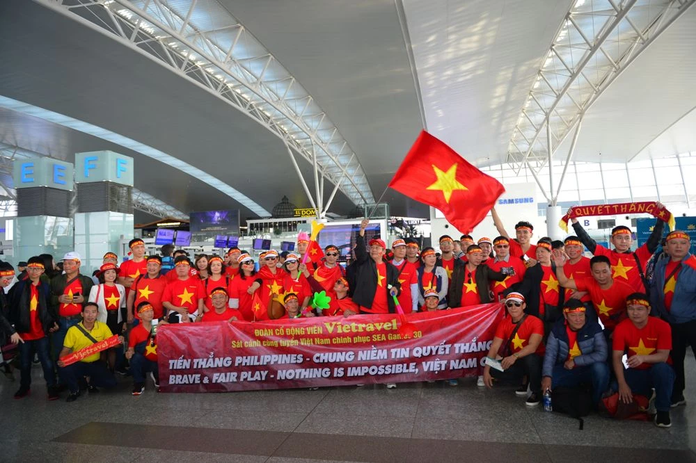 Các cổ động viên trên đường sang cổ vũ cho đội nhà thi đấu.