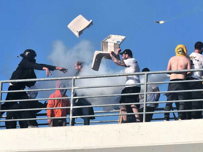 CĐV Hy Lạp sau khi đánh nhau đã quay sang tấn công luôn cảnh sát. Ảnh: GETTY IMAGES