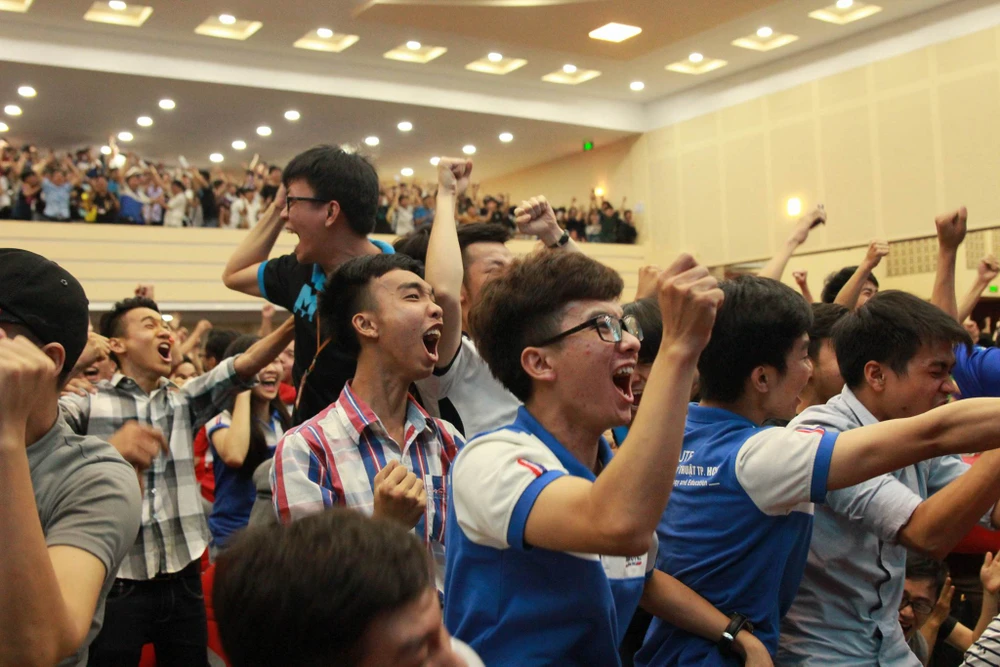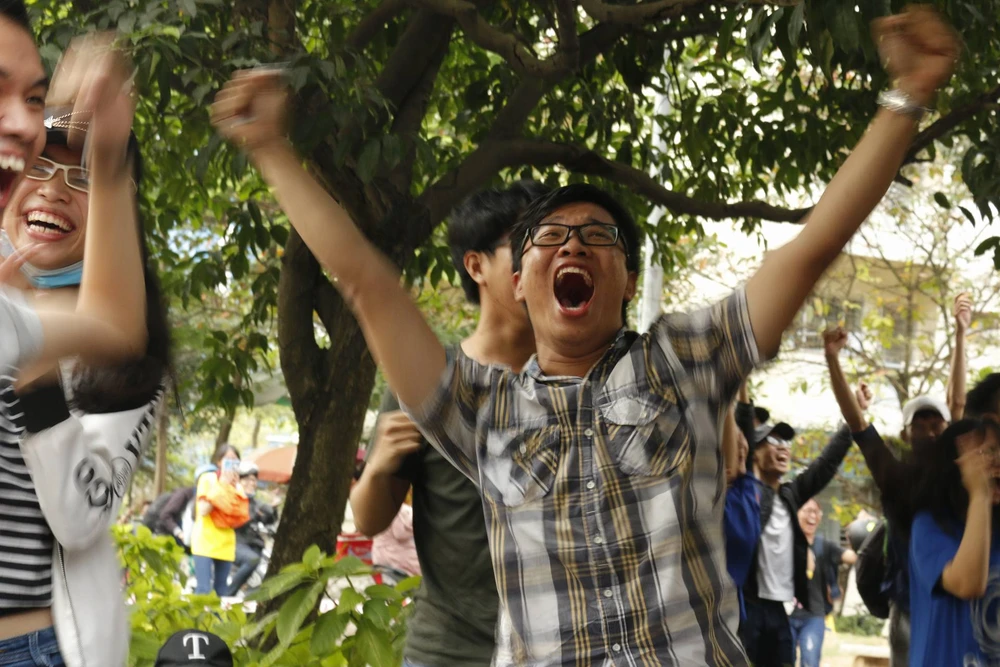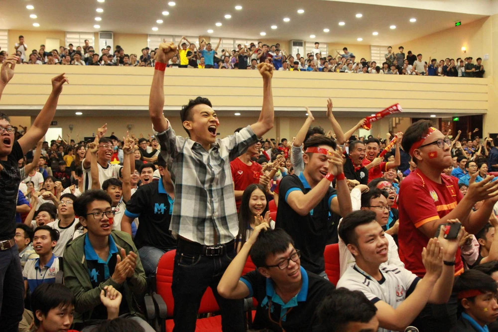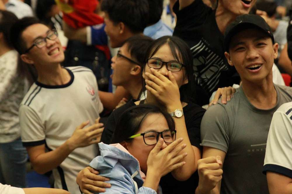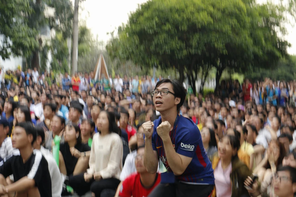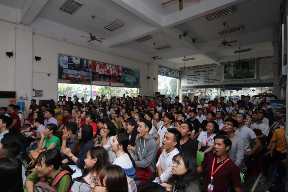 Cảnh sinh viên ăn mừng bàn thắng của Quang Hải ở trường ĐH Sư phạm Kỹ thuật TP.HCM. Ảnh: QUỐC VŨ.