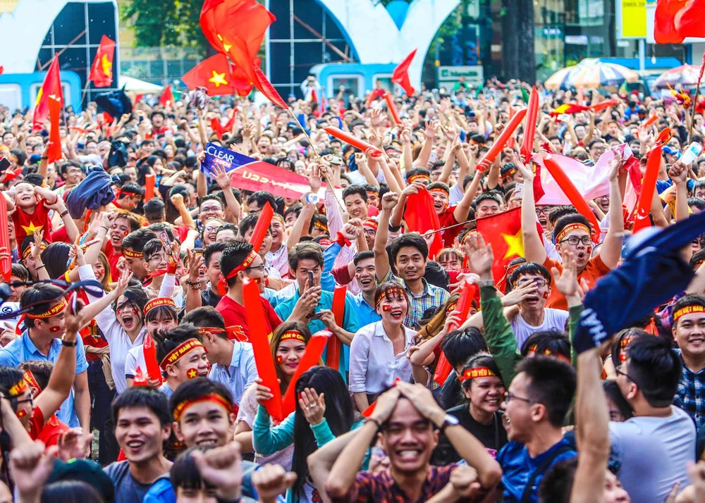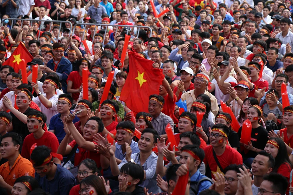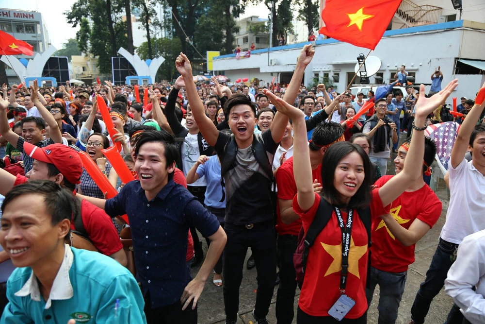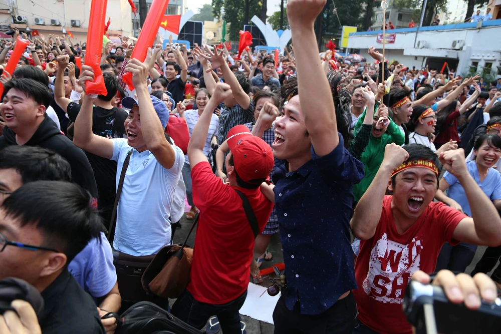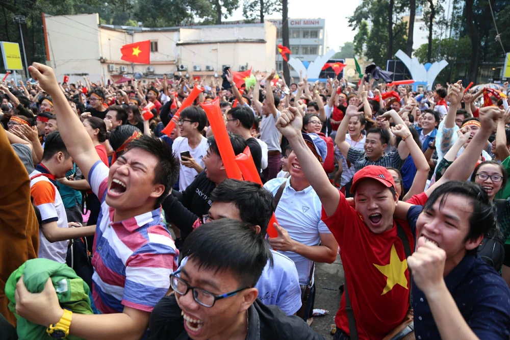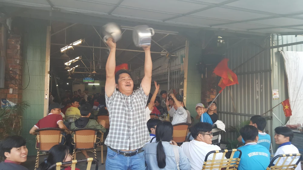 Cổ động viên ở Cần Thơ dùng nồi goc vào nhau để ăn mừng. Ảnh: Gia Tuệ