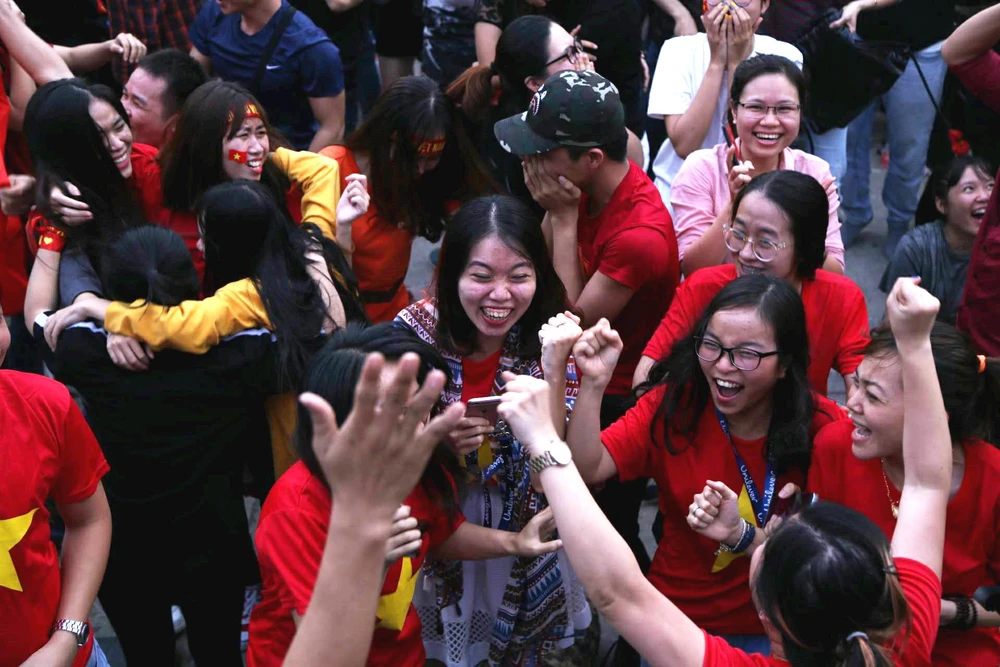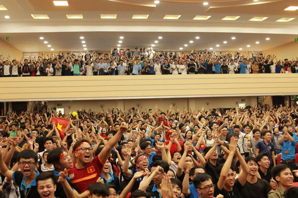 Sinh viên ở Khu KTX Đại học Quốc gia vui mừng với bàn thắng của Quang Hải. Ảnh: Tỷ Điểu