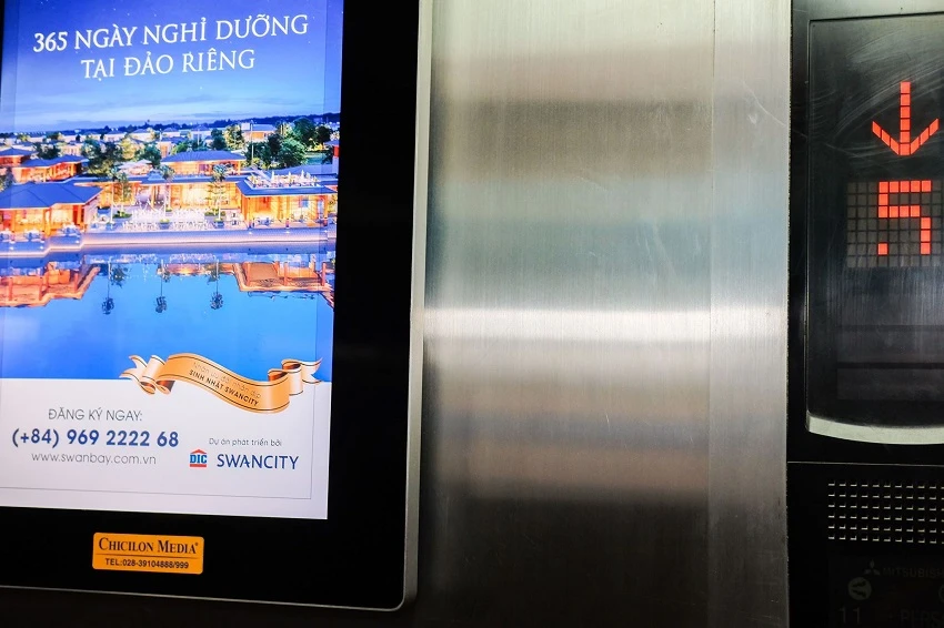 Theo quan điểm của Công ty Luật TNHH IPIC, diện tích thang máy có hạn, việc dùng điện chạy quảng cáo màn hình có thể mất mỹ quan và ảnh hưởng đến việc di chuyển bình thường (an toàn giao thông). Ảnh minh họa. Nguồn: Internet