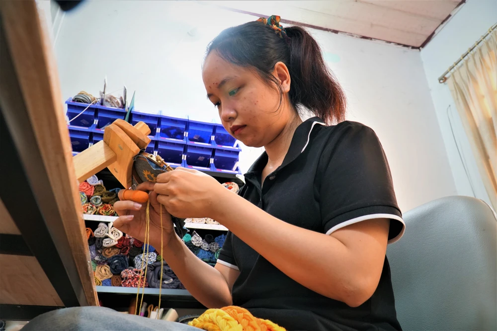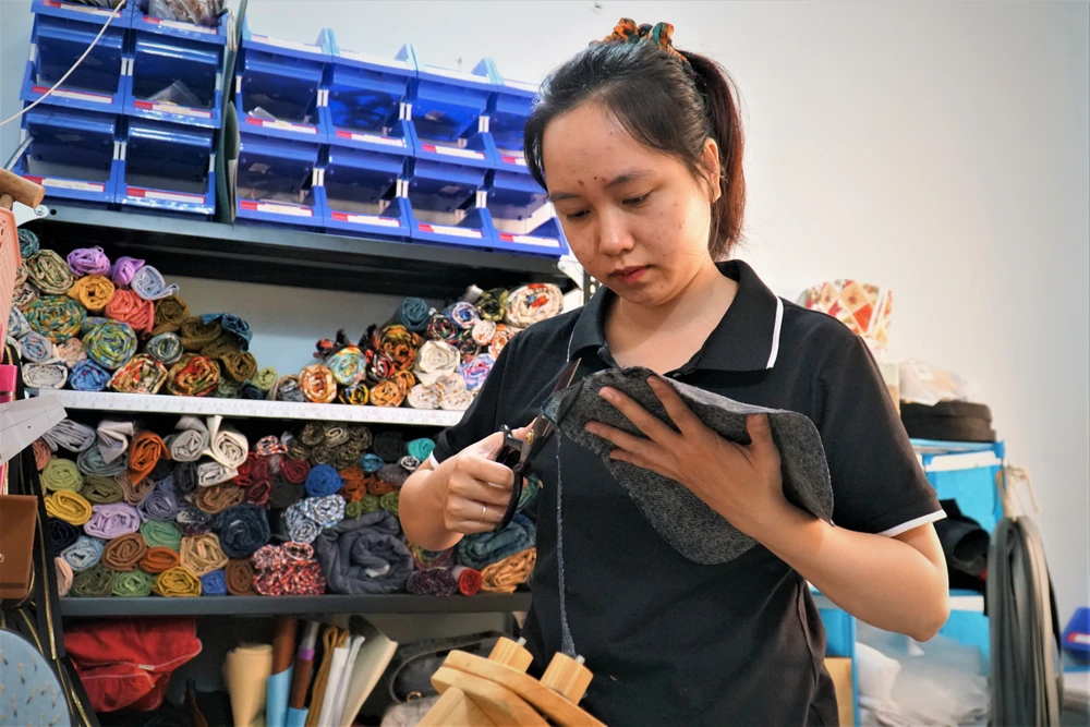 Sau khi thiết kế kiểu dáng phù hợp thì sẽ bắt đầu công đoạn chế tác, thêu thêm hoa văn, thêm phụ kiện, khoen gài, khóa kéo. Trung bình thời gian làm ra một sản phẩm mất từ 1 đến 2 ngày.