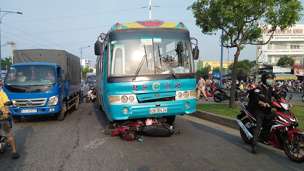 Tại hiện trường, chiếc xe máy hư hỏng nặng nằm trước đầu xe khách; trên mặt đường còn nhiều vết cày xước kéo dài, giao thông qua khu vực gặp không ít khó khăn.