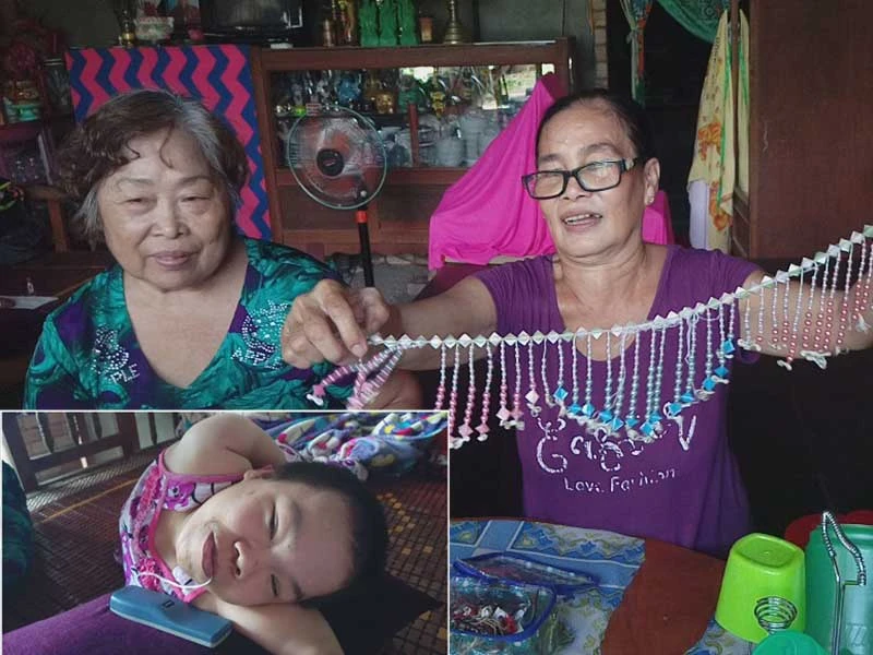 Bà mang ra khoe với chúng tôi nhiều xâu chuỗi, vòng tay bằng hạt cườm được kết vô cùng tỉ mỉ, rồi những con hạc giấy, những ngôi sao bằng ống hút cùng nhiều vật phẩm khác. “Tất cả đều do con gái tôi làm hết đó. Cái lưỡi của con bé kỳ diệu lắm, cứ để đồ vào miệng là nó làm được hết” - bà Tuôi tự hào. Nói rồi, hai mẹ con bà vui vẻ “biểu diễn” cho chúng tôi xem. Bà Tuôi lấy miếng giấy kiếng vuông đưa vào miệng chị Thúy An. Ngậm giấy kiếng, chị Thúy An dùng chiếc lưỡi uốn lượn qua lại, dùng môi bặm chặt miếng giấy thành hình tam giác, rồi hình thoi, rồi từng nếp gấp nhỏ. Vừa gấp giấy trong miệng, chị vừa huyên thuyên “tám” chuyện với mọi người. Chẳng mấy chốc một con hạc giấy xinh xắn với những đường gấp tinh tế, sống động được nhả ra từ miệng chị Thúy An.