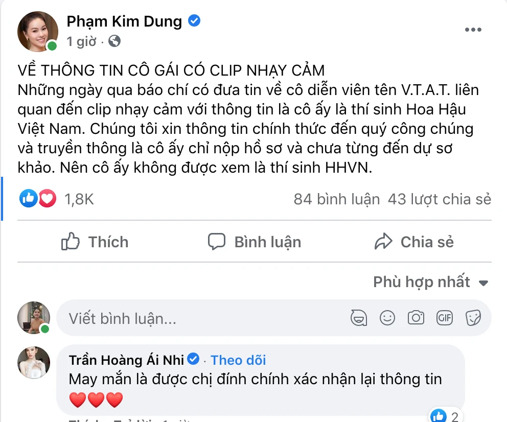 “Những ngày qua báo chí có đưa tin về cô diễn viên tên V.T.A.T. liên quan đến clip nhạy cảm với thông tin là cô ấy là thí sinh Hoa Hậu Việt Nam. Chúng tôi xin thông tin chính thức đến quý công chúng và truyền thông là cô ấy chỉ nộp hồ sơ và chưa từng đến dự sơ khảo. Nên cô ấy không được xem là thí sinh Hoa hậu Việt Nam”- bà Kim Dung thông tin.