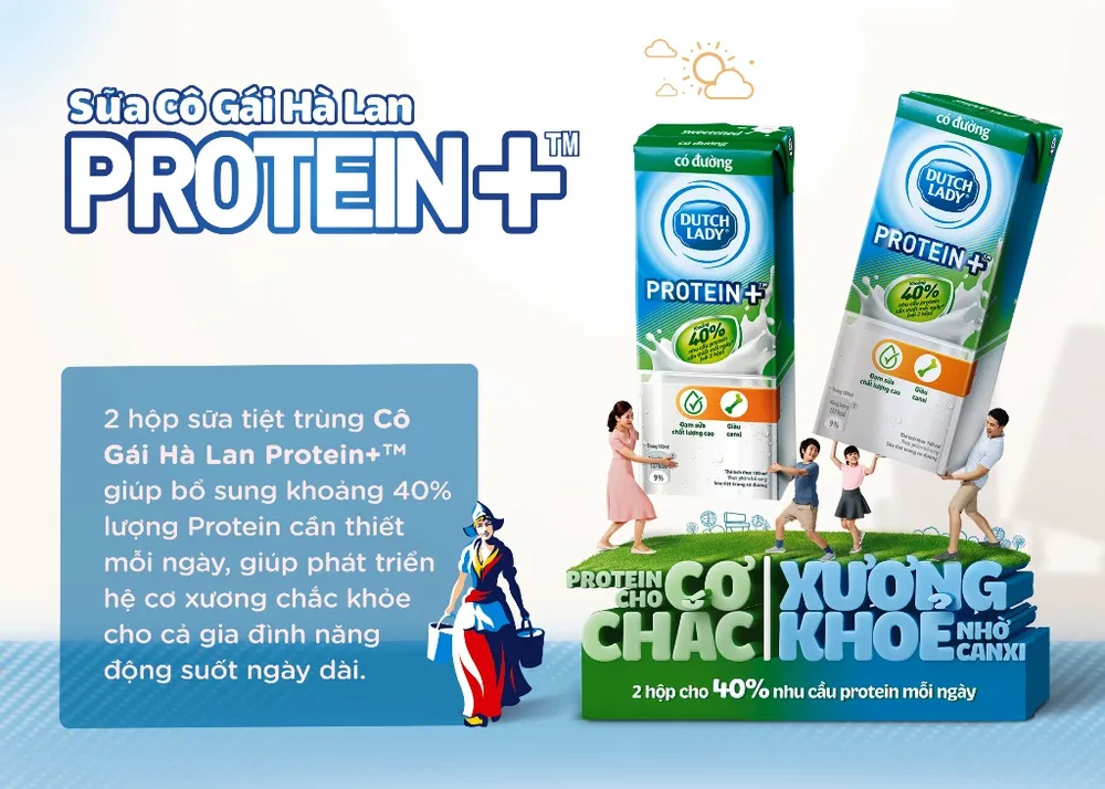 Sữa tiệt trùng có đường của nhãn hàng Cô Gái Hà Lan Protein+ là sản phẩm sữa Protein đầu tiên tại thị trường Việt Nam có hàm lượng đạm sữa chất lượng cao đạt ngưỡng cao nhất và dễ dàng cho cơ thể hấp thụ. Kết hợp hai hộp sữa Cô gái Hà Lan Protein+ vào khẩu phần ăn hàng ngày sẽ đáp ứng 40% nhu cầu Protein cần thiết (*) đồng thời duy trì sự năng động cả ngày của các thành viên trong gia đình.