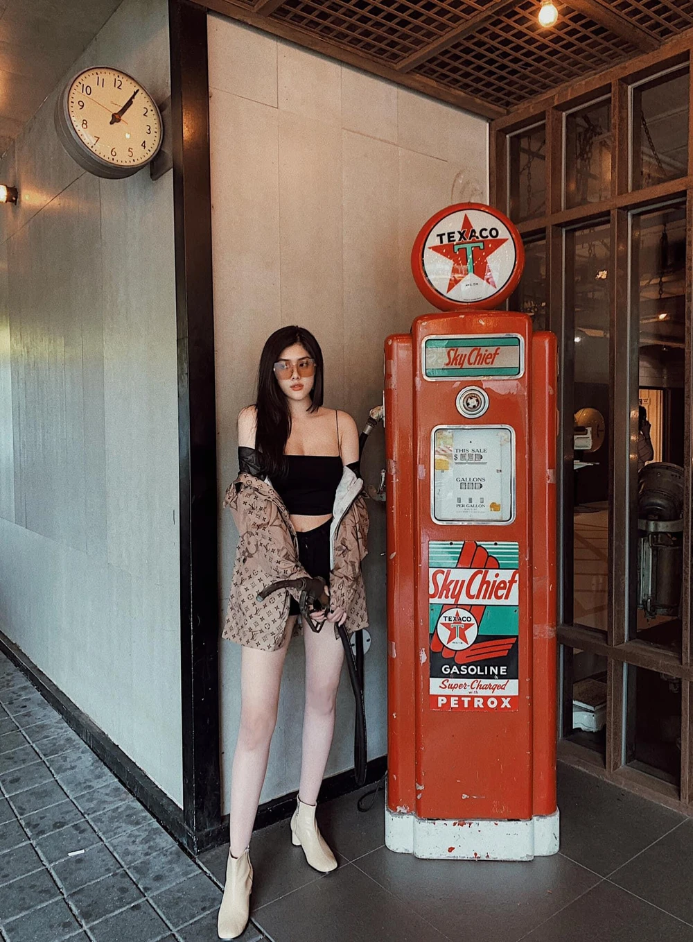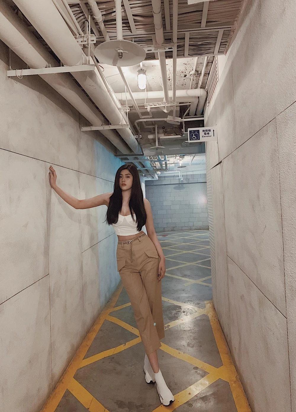 Chuyến du lịch trong bốn ngày ba đêm, hoa hậu châu Á 2016 chủ yếu lựa chọn áo quây ôm sát mix match cùng quần cạp cao với những gam màu đen, trắng, be. Có thể kết hợp cùng phụ kiện kính mắt, thắt lưng dây xích hoặc giày thể thao giúp tôn chiều cao ấn tượng 1,84 m.