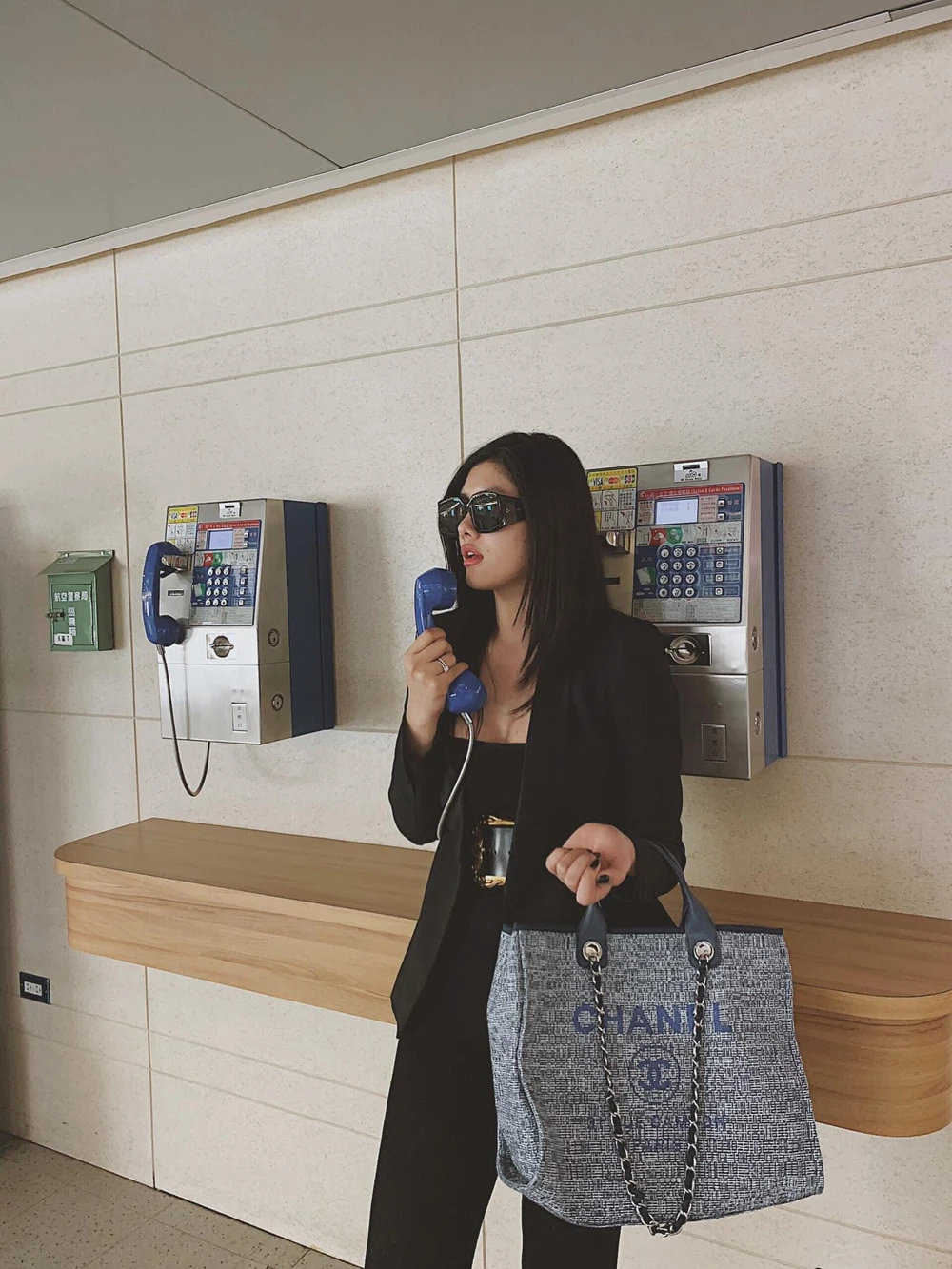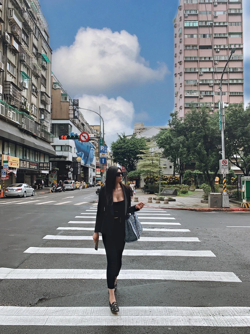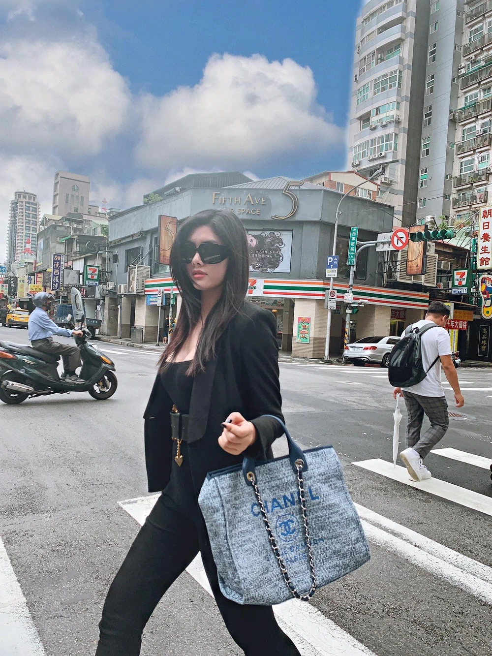 Ngày đầu tiên tới Đài Loan, Huỳnh Tiên lựa chọn set đồ đen thanh lịch, nhẹ nhàng dạo bước trên đường phố. Điểm nhấn là thắt lưng to bản cùng chiếc túi xách Chanel gam màu xanh dịu mát.