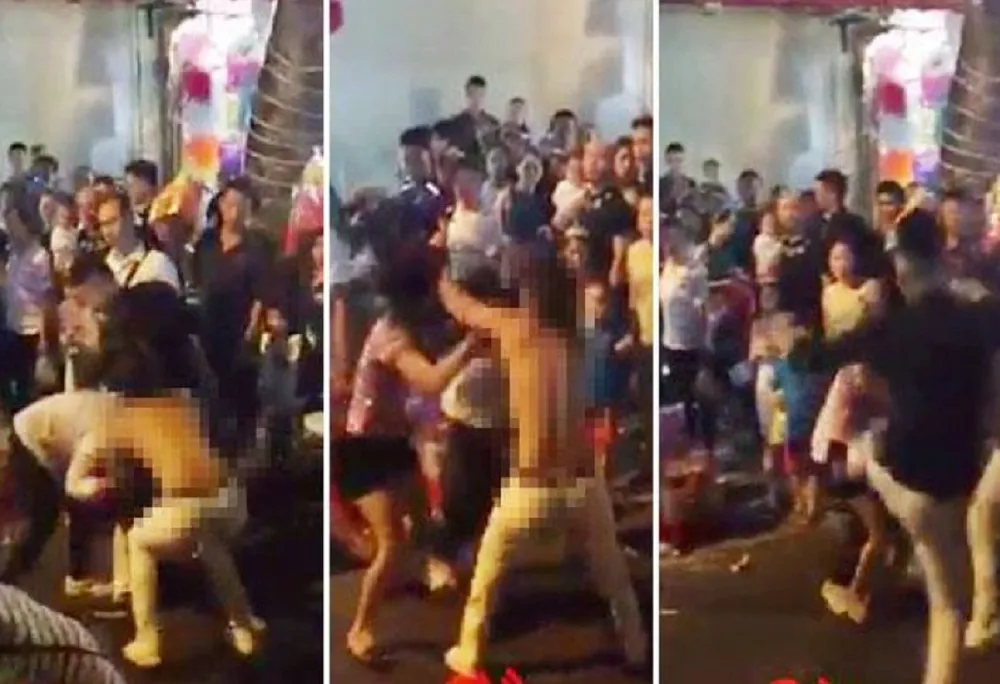 Trong lúc hai bên đang giằng co giữa đường, cô gái đi cùng nam thanh niên bị giật tung áo trước đám đông. Dù vậy, cô này vẫn hùng hổ tiếp tục lao vào giằng co, đánh nhau với hai phụ nữ.