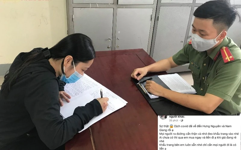 - Trước đó, ngày 3-8, chị NTYT (19 tuổi, trú tại xã Nam Giang, huyện Nam Đàn, Nghệ An) lên Facebook cá nhân đăng thông tin sai sự thật: “Sợ thật, dịch COVID-19 đã về đến Hưng Nguyên và Nam Giang rồi ạ. Mọi người ra đường cẩn thận và nhớ đeo khẩu trang vào nhé. Ai chưa có thì qua em mua ngay và liền đi ạ khi giá đang rẻ nhé. Khẩu trang bên em luôn sẵn nhé chỉ cần mọi người ới là có liền ạ”.