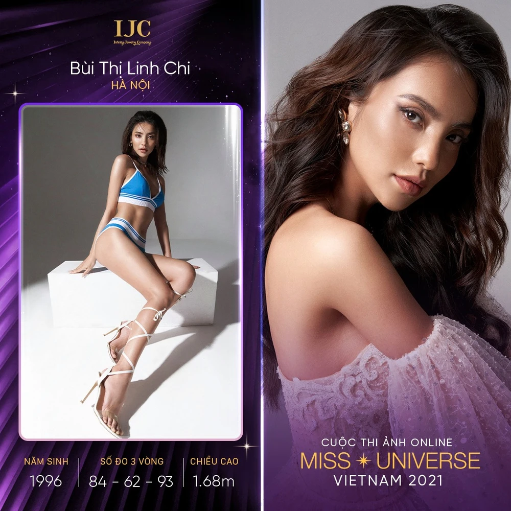 Linh Chi cao 1m68, với số đo hình thể: 84-62-93. Nhưng điều quan trọng, nguồn năng lượng tích cực, tinh thần hoà ái và bản sắc riêng của Linh Chi là điểm cộng rất lớn trong hành trình chinh phục Hoa hậu Hoàn vũ 2021.