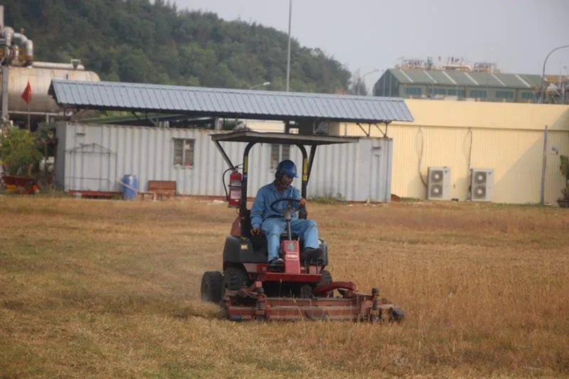 Công nhân cắt cỏ bên trong nhà máy. Ảnh: TẤN VIỆT