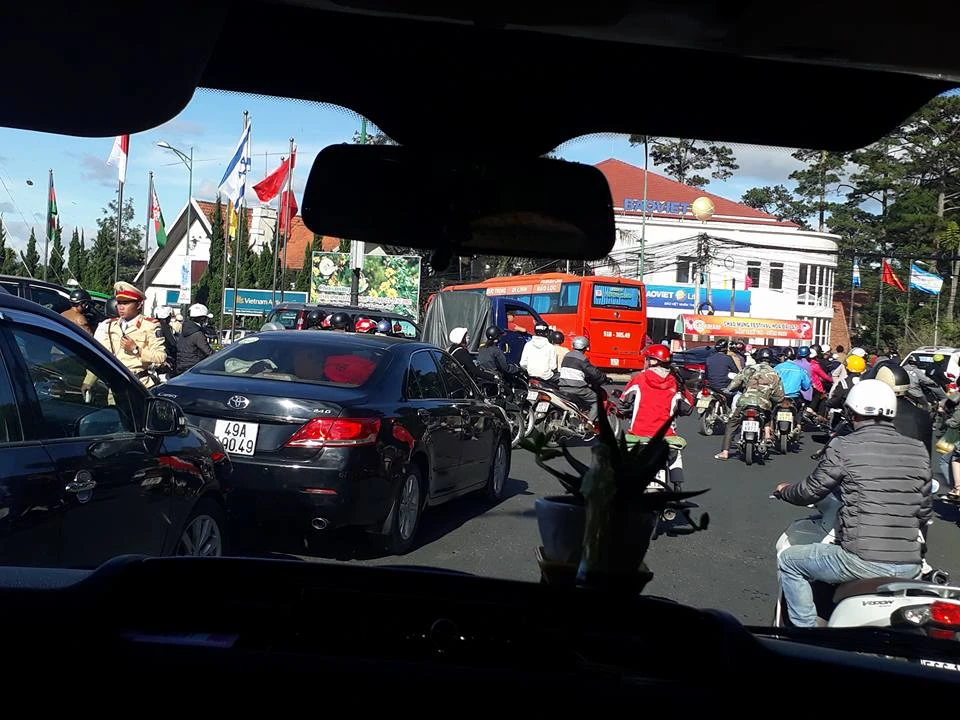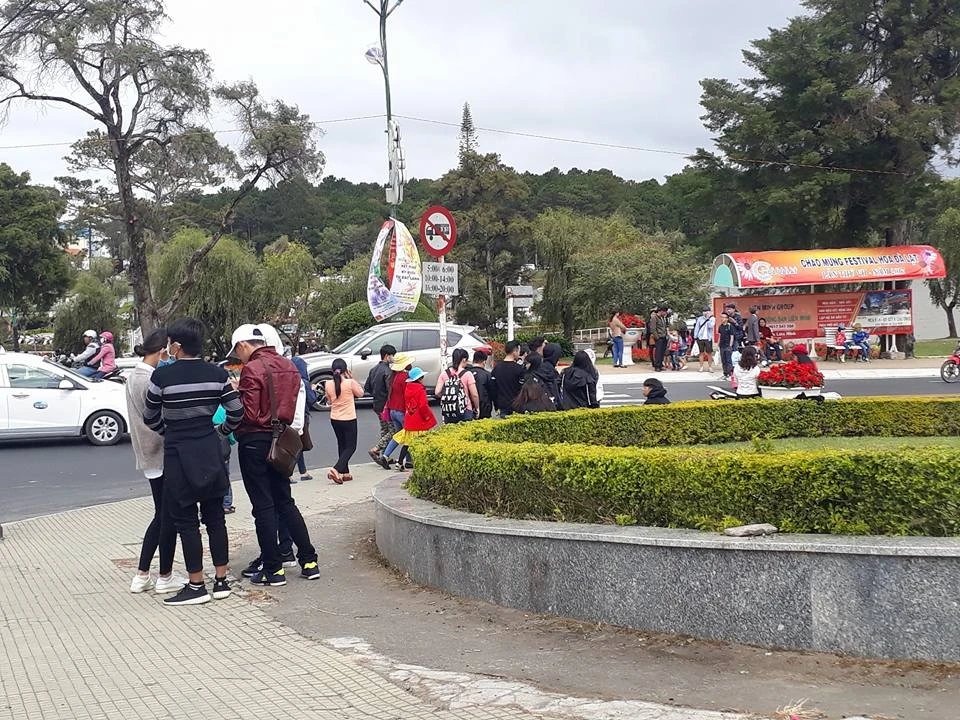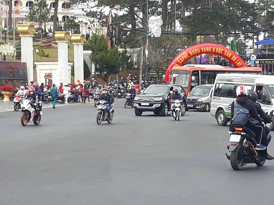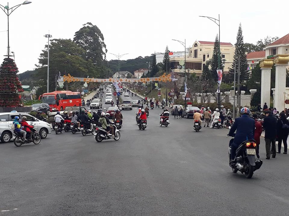 Sáng đến trưa 24-12, sự đông đúc trên các đường phố Đà Lạt vẫn được duy trì. Nhiều giao lộ trong thành phố lượng xe cộ luôn khá dày. Đường phố xuất hiện nhiều thanh niên chở đôi đi xe máy, đi nhiều xe thành nhóm tạo nên không khí sôi động. Cá biệt, có nhóm còn cử hẳn một xe chạy phía trước giơ cây chụp ảnh “tự sướng” chụp hình cả nhóm đang chạy xe máy phía sau nhìn vào rất nguy hiểm, không an toàn. Lượng người đi bộ cũng khá nhiều. Vẫn không có tình trạng kẹt xe.