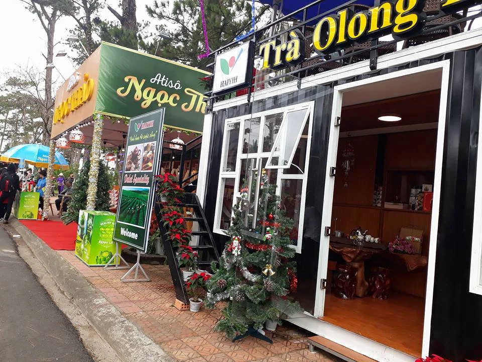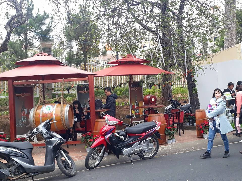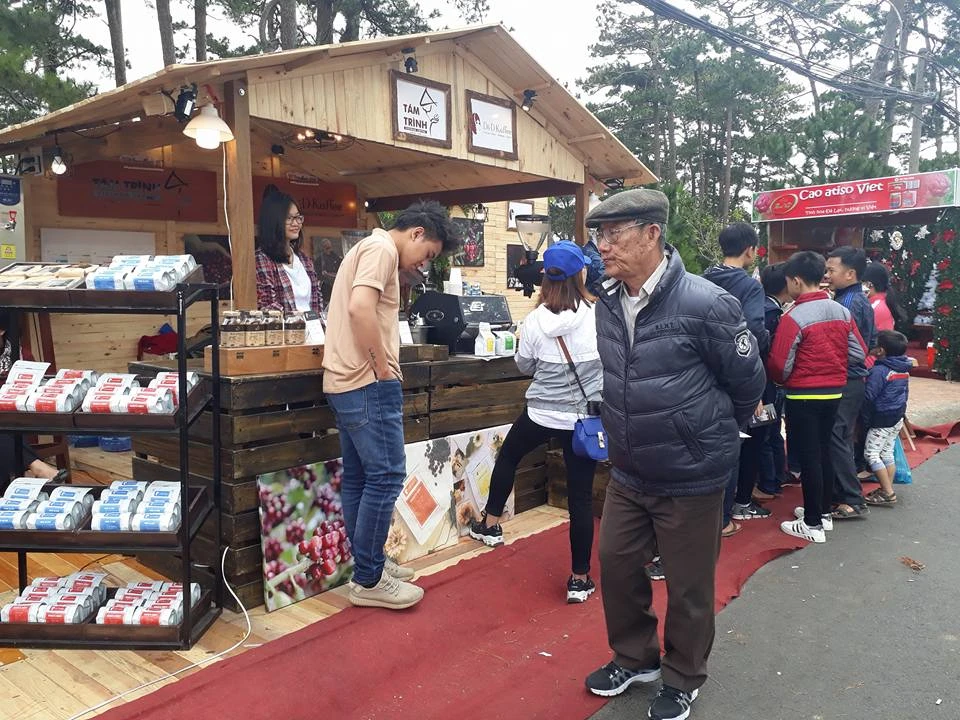 Gian hàng cà phê đậm chất Đà Lạt bằng gỗ thông.