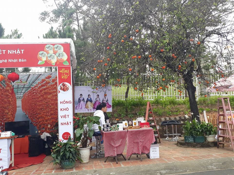 Gian hàng trà Việt Nhật với cây hồng giả rất nhiều trái được tạo ra trên phố trà, rượu, cà phê, đặc sản.
