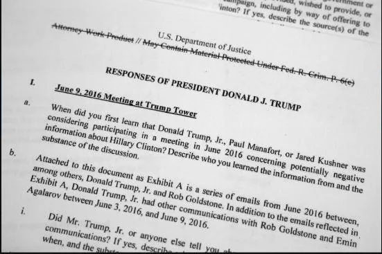 Các trả lời bằng văn bản của Tổng thống Trump cho cuộc điều tra đặc biệt. Ảnh: AP