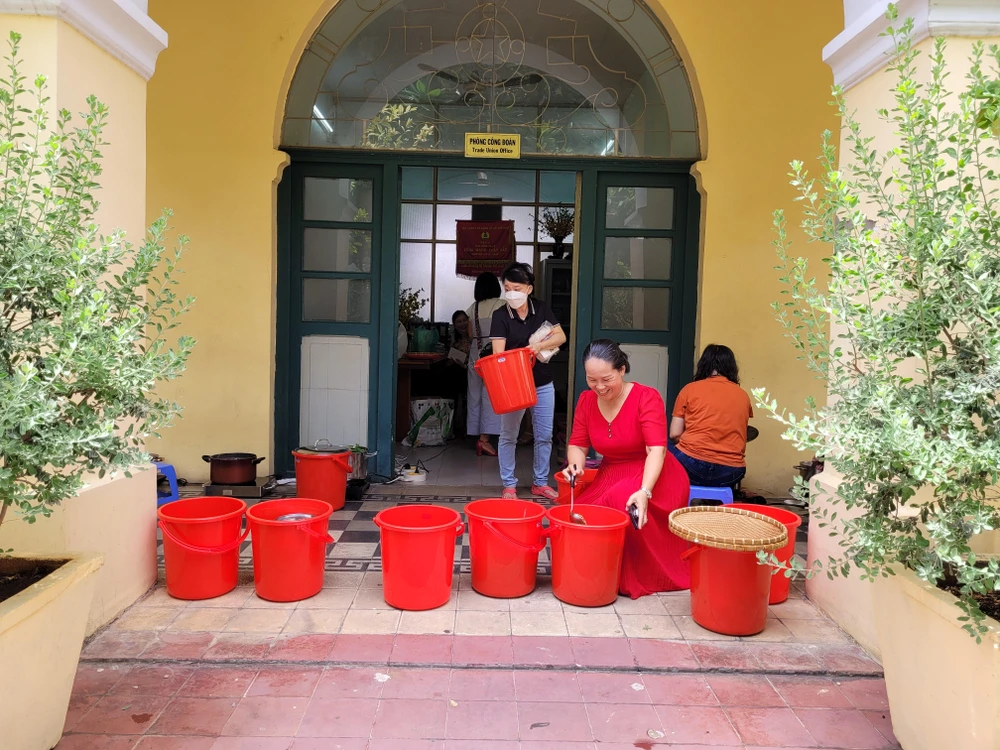Hơn 20 năm gắn bó với ngôi trường, cô Chung Thanh Huyền, chia sẻ: “Tôi khởi xướng việc nấu chè được ba năm rồi. Năm trước vì dịch COVID-19 nên không thể nấu được cho các con, bản thân tôi cũng thấy tiếc. Những lần trước tôi thường chỉ nấu ở nhà, đến ngày lễ thì mang vào cho các con thôi. Năm nay có các cô làm ở công đoàn ngỏ ý phụ giúp một tay, nên tôi quyết định mang hết nguyên vật liệu vào đây”.