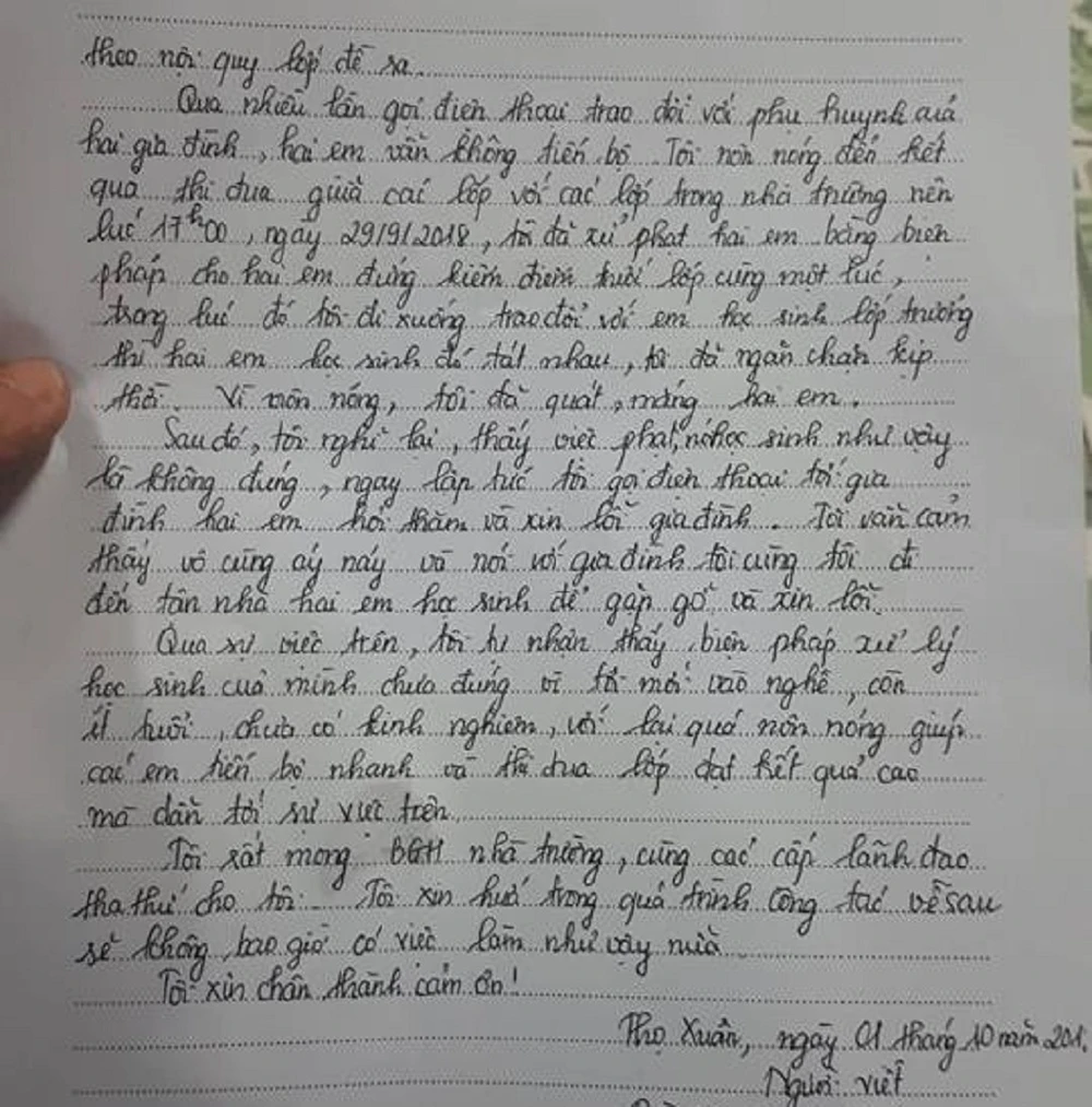 Trước đó, theo đơn phản ánh của phụ huynh Trường THCS Thọ Xuân, vào ngày 29-9, trong giờ học môn toán, cô giáo TTMH là chủ nhiệm lớp 6D, Trường THCS Thọ Xuân phát hiện hai học sinh nói chuyện riêng. Cô H. đã yêu cầu hai học sinh lên đứng trên bục giảng tự tát vào mặt nhau cho đến khi bạn khóc mới dừng.